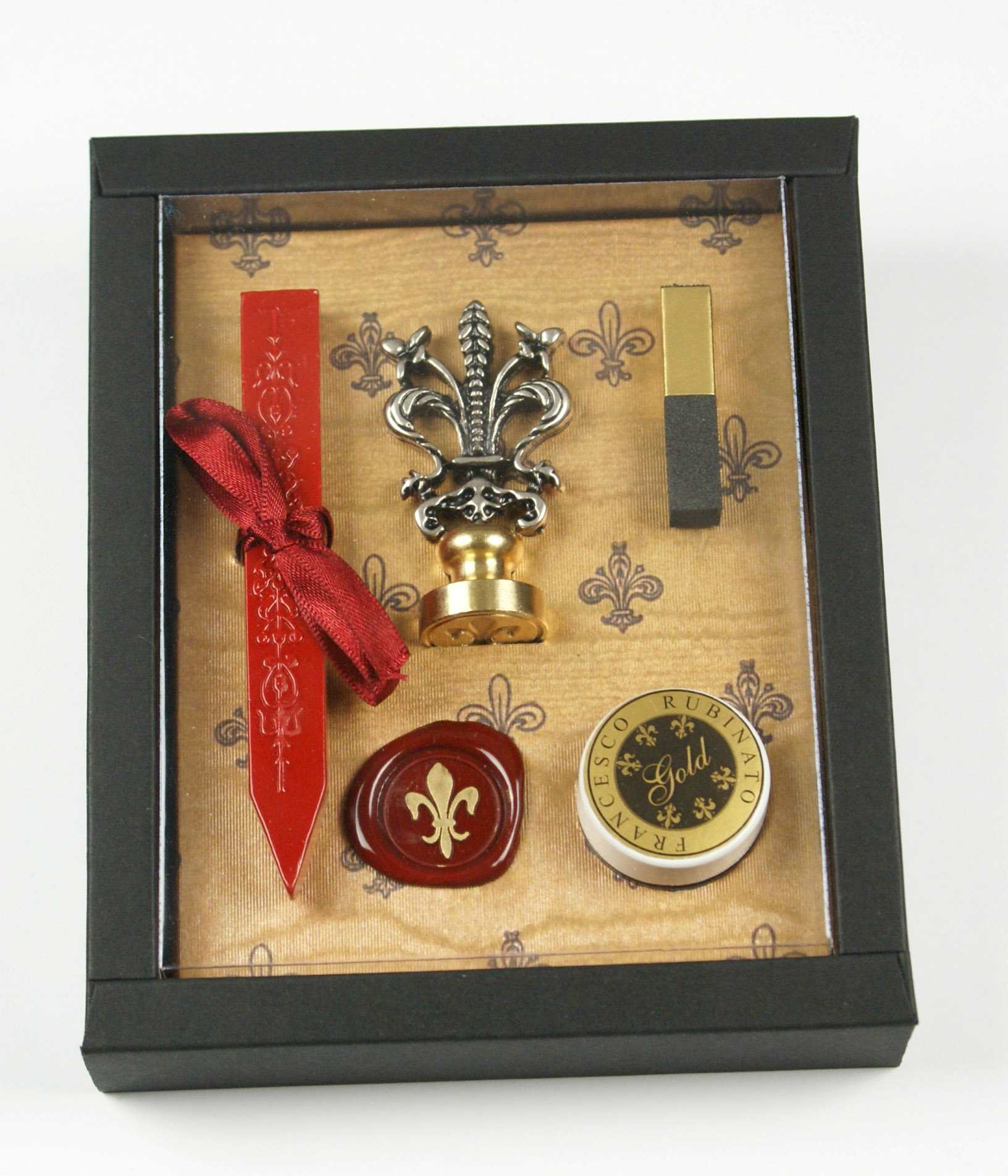 Anjou liliomos pecsételő készlet díszdobozban, amely tartalmaz egy különösen díszes réz pecsételőt (anjou liliomos mintával), egy bordó viaszt, és egy arany port applikátorral a pecsétnyomat kiemeléséhez, anjou liliomos mintájú díszdobozban.