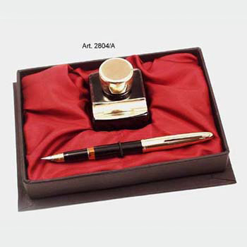 Arany díszítésű tintatartó, műanyag töltőtoll, vörös selyembélésű díszdobozban