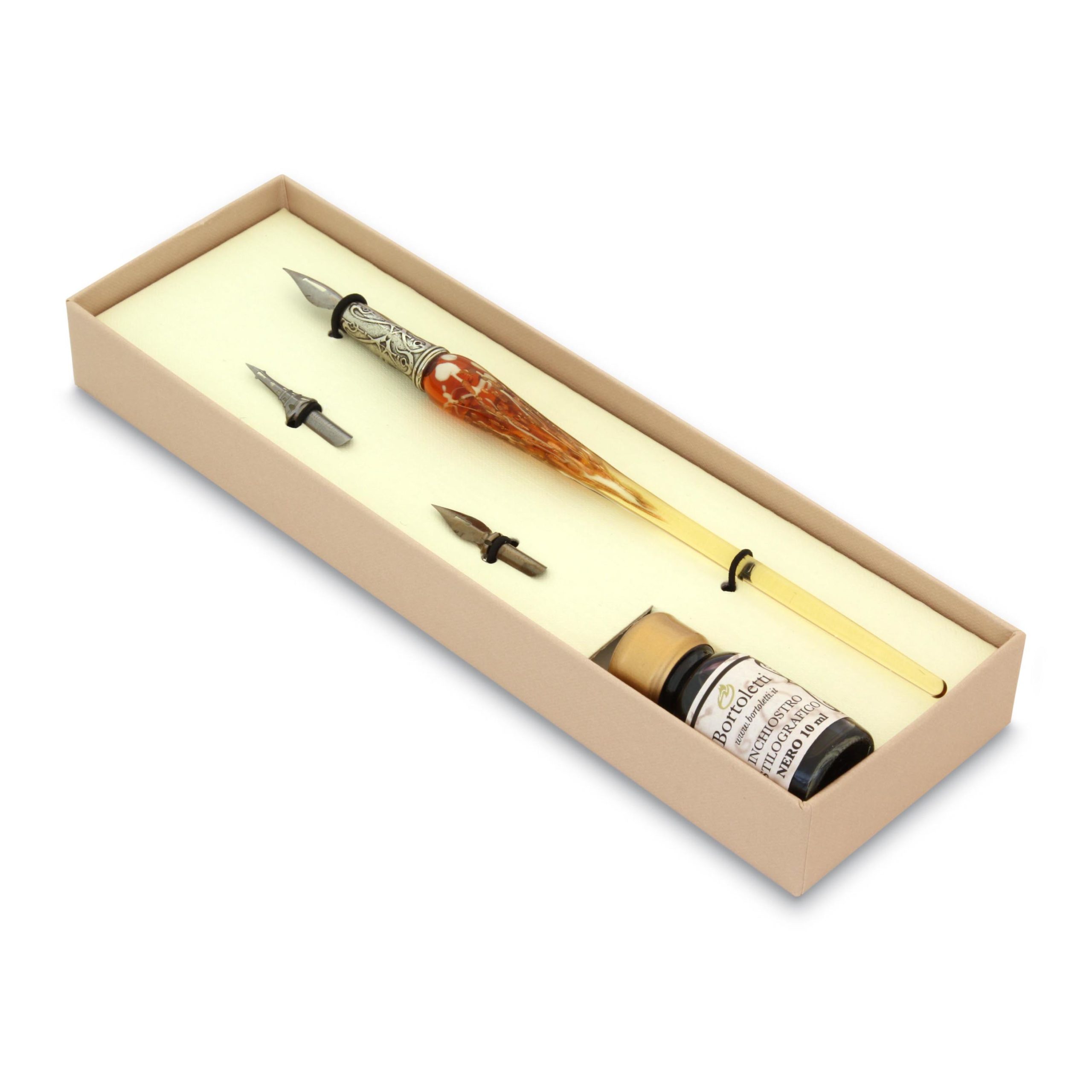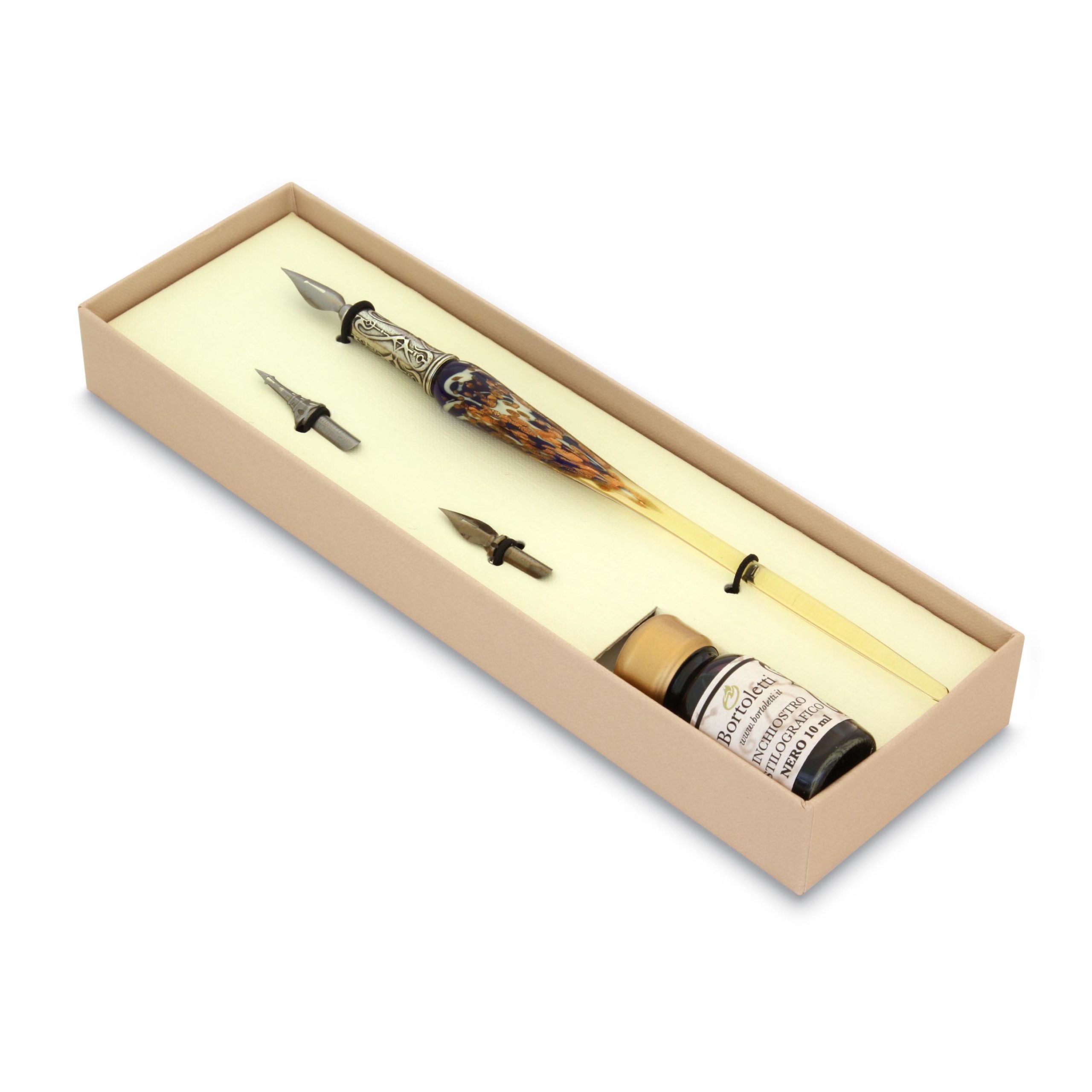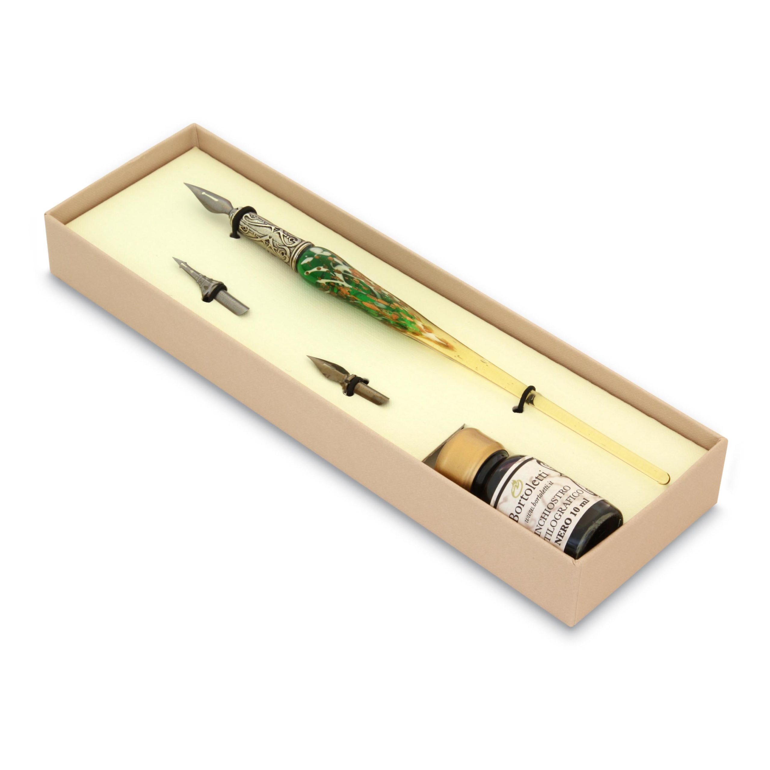 Aventurin és muránói üveg keverékéből készült toll, egy kis üveg tinta és két antik hegy.