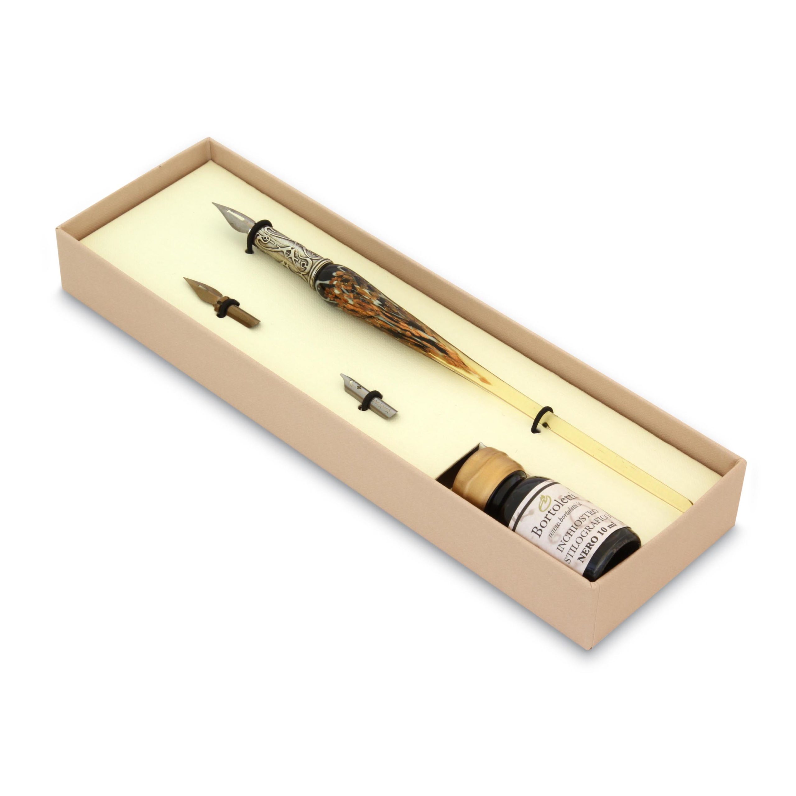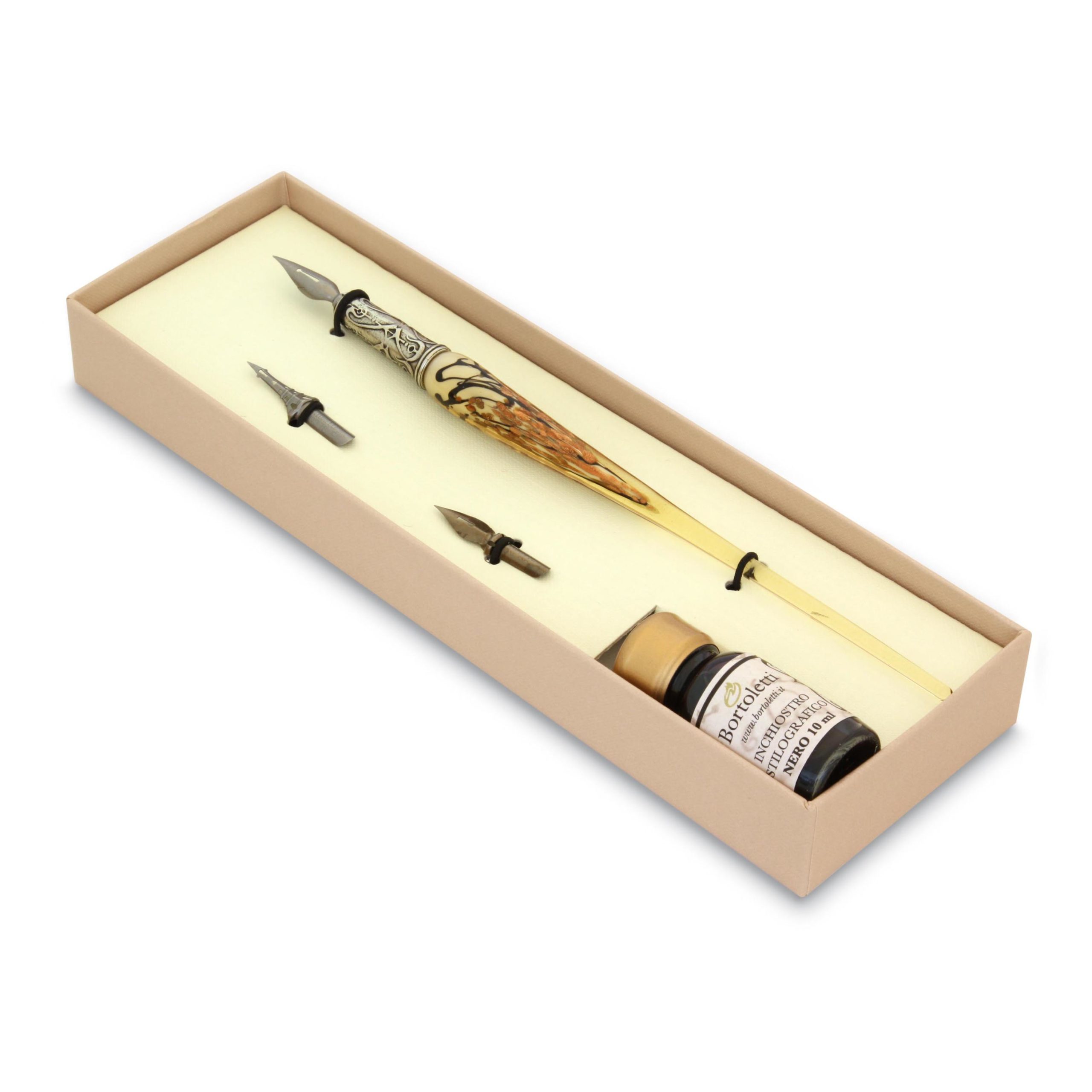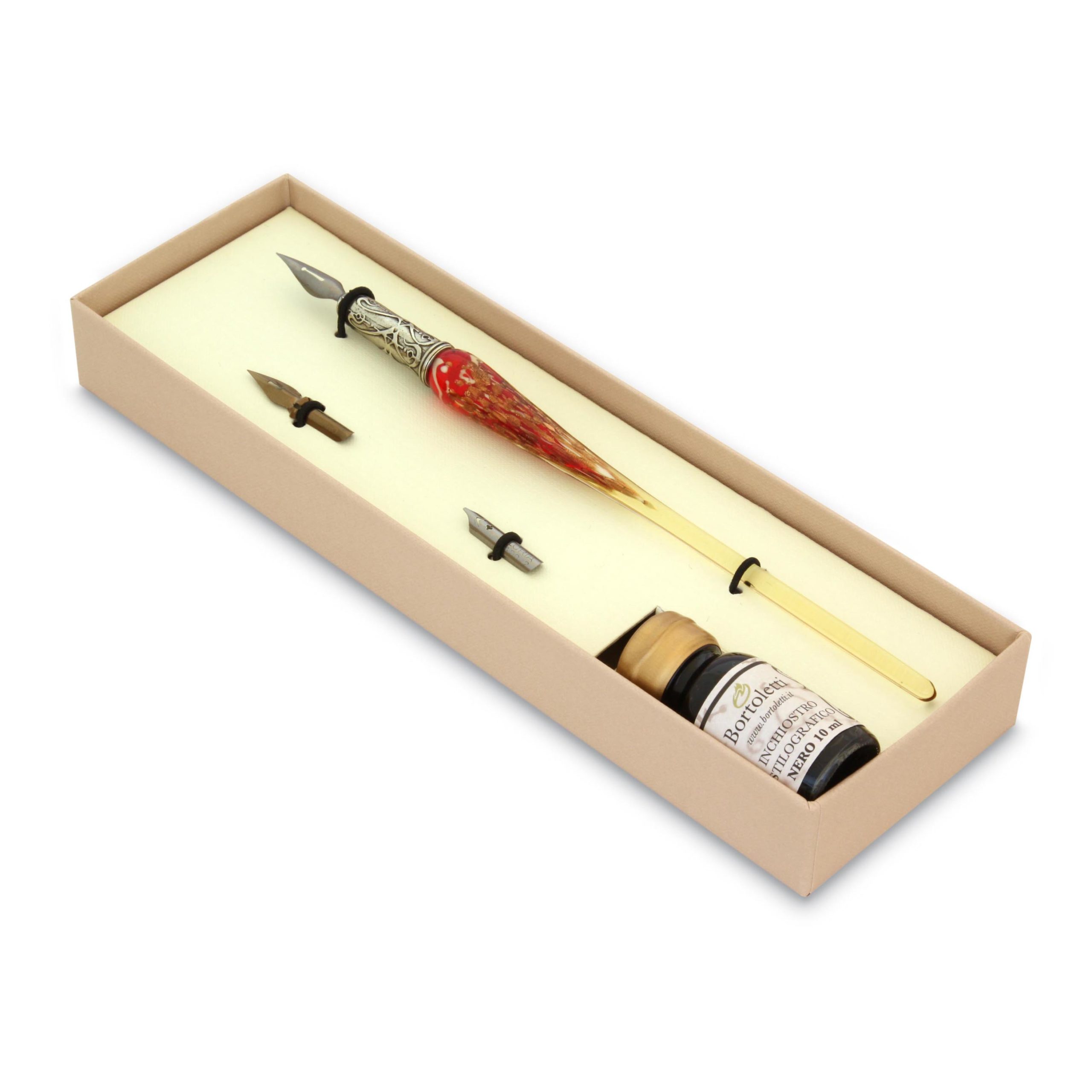 Aventurin és muránói üveg keverékéből készült toll, egy kis üveg tinta és két antik hegy.
