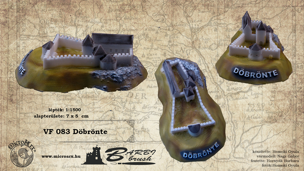 Magyar várak kicsiben sorozat, Döbrönte vármakett 1:1500 lépték, alapterülete: 7 cm x 5 cm.