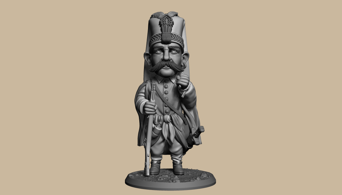 „Funny History” karikatúra figura sorozat híres magyar történelmi személyekről, katonákról. Festetlen műgyanta makett. Méret: 70 mm. Anyaga: műgyanta, festetlen szürke, szereletlen.