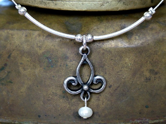 Kis inda nyakék gyöngyház gyönggyel (ezüstözött) A medál mérete: 16 x 21 mm; a nyakék hossza: (standard) 40 cm; felület: antikolt, ezüstözött, színváltozat: ezüstözött; alapanyag: spiáter.