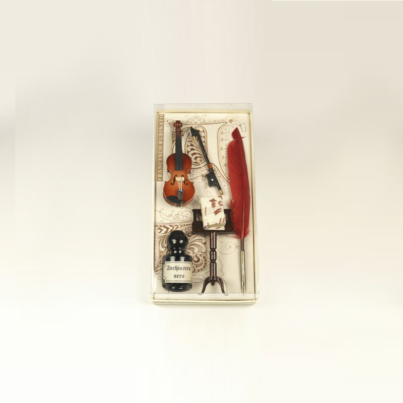 Kis zenei írószerkészlet 5 ml-es tintával, pennával, hegedűvel és egy mini kottatartón lévő minikönyvvel díszdobozban (dobozméret: 15 x 7,5 x 3 cm) Jelenleg fehér kis pennával kapható.