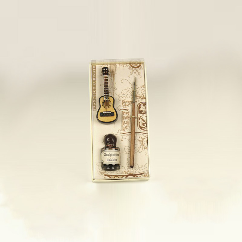 Kis zenei írószerkészlet 5 ml-es tintával, 1 db fanyelű irónnal, dísz miniatűr fa gitárral díszcsomagolásban (doboz méret 14 x 6 x 3 cm)