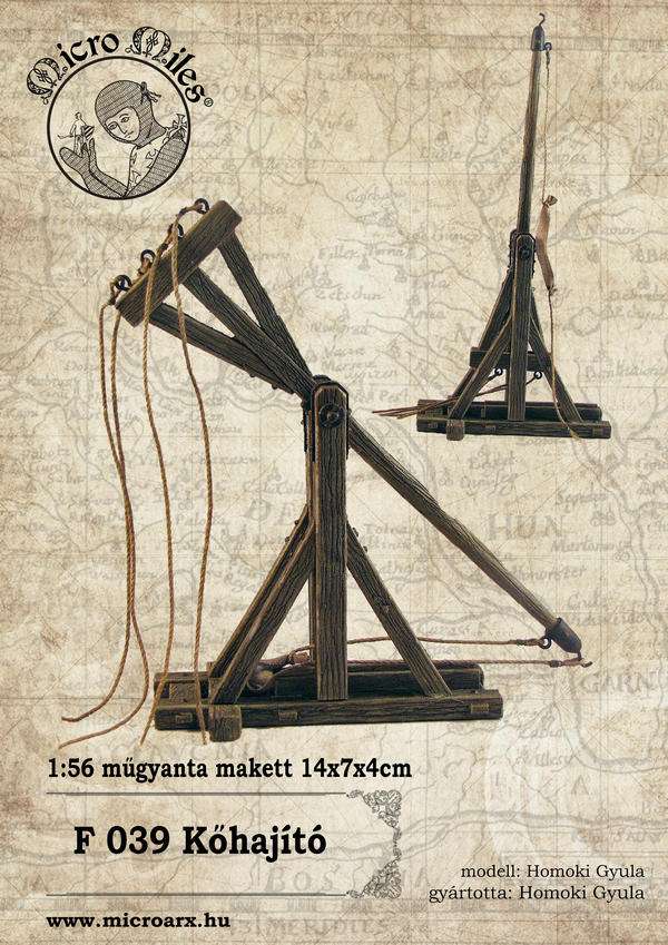 Középkori kőhajító gép, nagy festett modell-figura; 1:56 méretarányú makett; anyaga: műgyanta; színe: festett Méretek: 14 x 7 x 4 cm