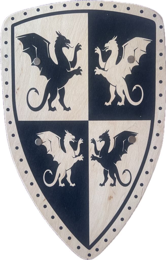 Közepes méretű lovagi pajzs, 5 mm vastag rétegelt lemezből kivágva, csiszolva és középkori motívumokkal díszítve. Mérete: 40 x 25 x 1 cm