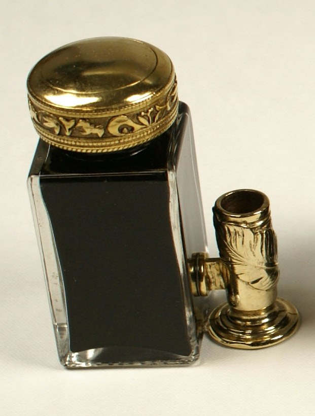 Különleges irontartós tinta 75 cl tintával díszes fém kupakkal és irontartóval A tinta színe: sephia (barna) Jelenleg arany és ezüst színű változatban kapható.