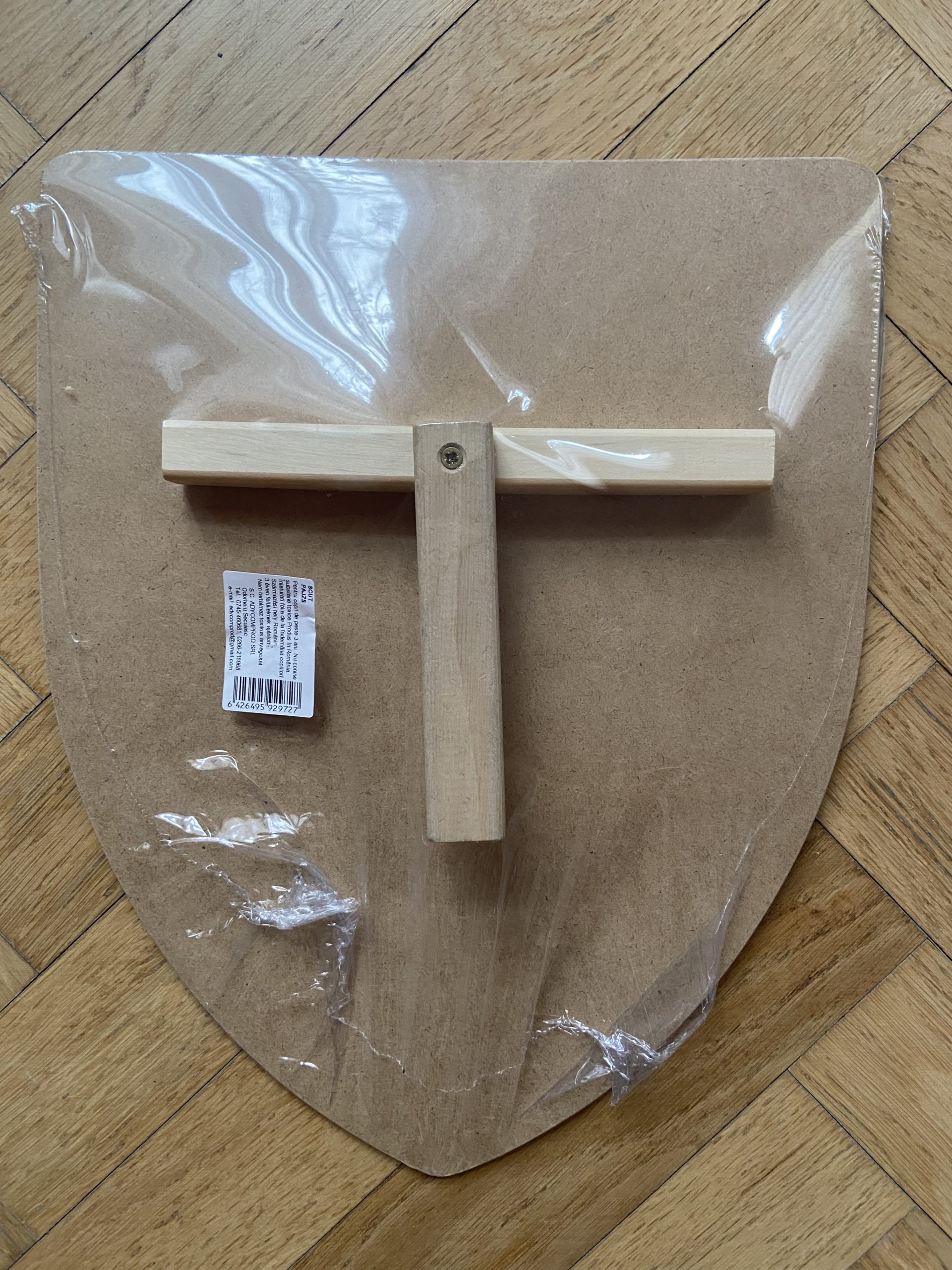 Lovagi pajzs, 3 mm vastag mdf-lapból kivágva, felületén ragasztott kép motívumokkal díszítve. Hátulján fa fogantyúval. Mérete: 36 x 29 cm