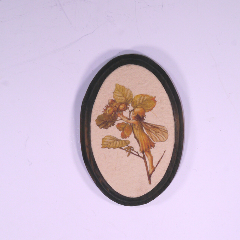 Merített papírkép antikolt képkeretben Ovális kiskép tündéres sorozat, a képkeret mérete: 6 x 8 cm (szél/mag), a merített papírkép mérete: 3,5 x 5,5