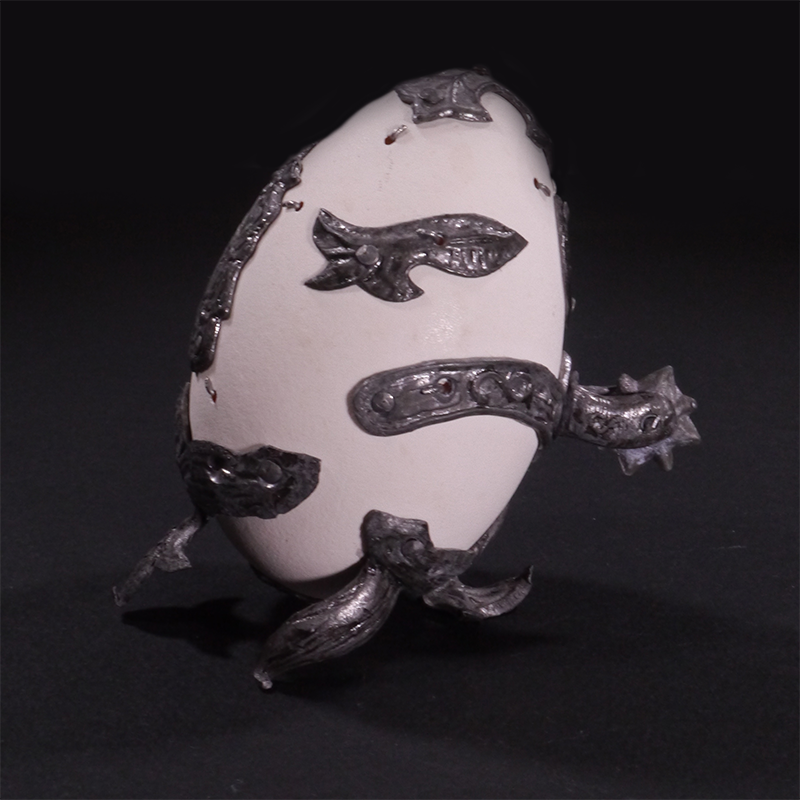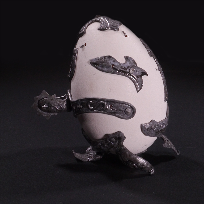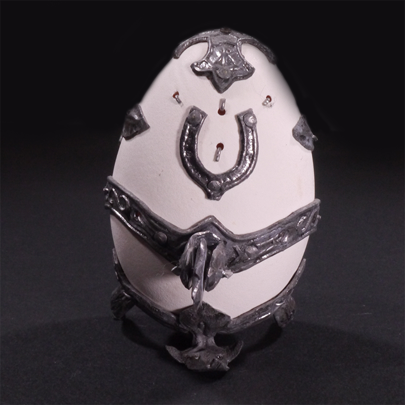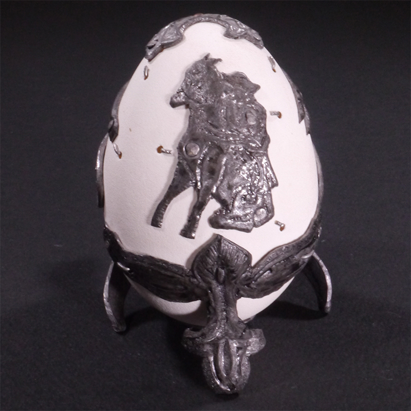 Sarkantyús lúdtojás: patkó, véső, csikós, tetején indadíszes motívummal.